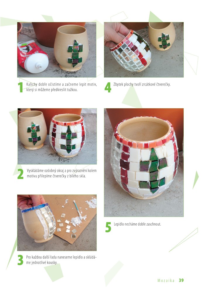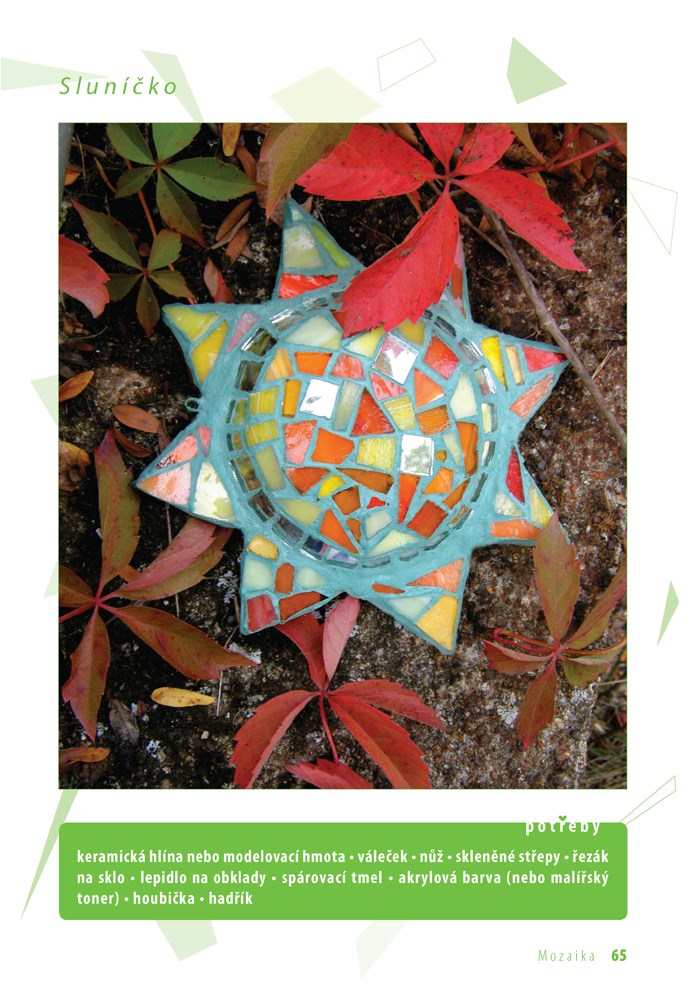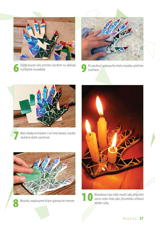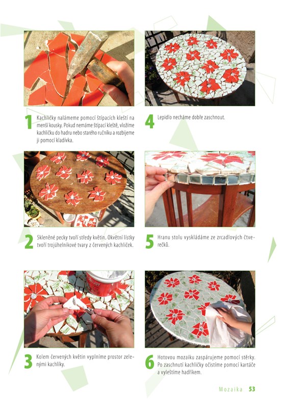 Technika zdobení stěn obrazy poskládanými z drobných barevných prvků lákala po celá staletí architekty, malíře a sochaře a je oblíbená dodnes. Lze ji použít jak v interiéru na stěny, podlahy, stropy, nábytek či nejrůznější dekorační předměty, tak v exteriéru. Vyzkoušejte si mozaiku kamínkovou, keramickou, skleněnou, zrcadlovou, kachlíkovou, korálkovou, plíškovou nebo z malovaných sklíček a vytvořte si pomocí názorných fotografických postupů originální stolek, lampičku, šperkovnici, talíř, brož, zrcadlo i nejrůznější dekorativní předměty.