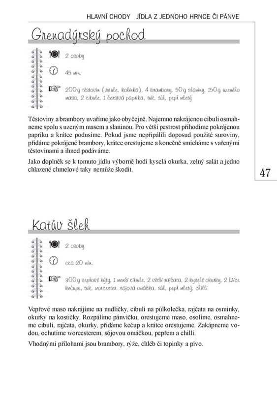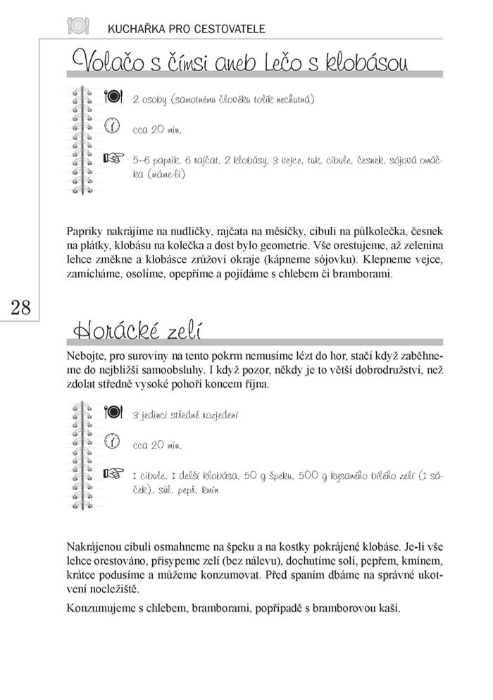 Následuje část zásadní, tedy receptová. V té najdete osvědčené cestovatelské polévky, vydatné vodácké předkrmy a chuťovky, vydatná poutnická jídla z jednoho hrnce a další hlavní chody (ty s použitím turistického salámu jsou samozřejmostí). Jídla masitá i bezmasá, vařená, opékaná i grilovaná.
