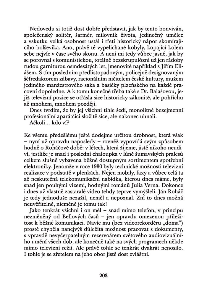 Tato kniha vypráví nejen o jednotlivých etapách Roháčova uměleckého a rovněž tak značně hektického společenského života, ale i o peripetiích televizní a divadelní tvorby v 50. až 70. letech tehdejšího Československa. Přináší celou řadu autentických svědectví četných Roháčových přátel, kolegů, současníků a stejně tak i velké množství konkrétních a často nově objevených souvislostí a dokumentů.