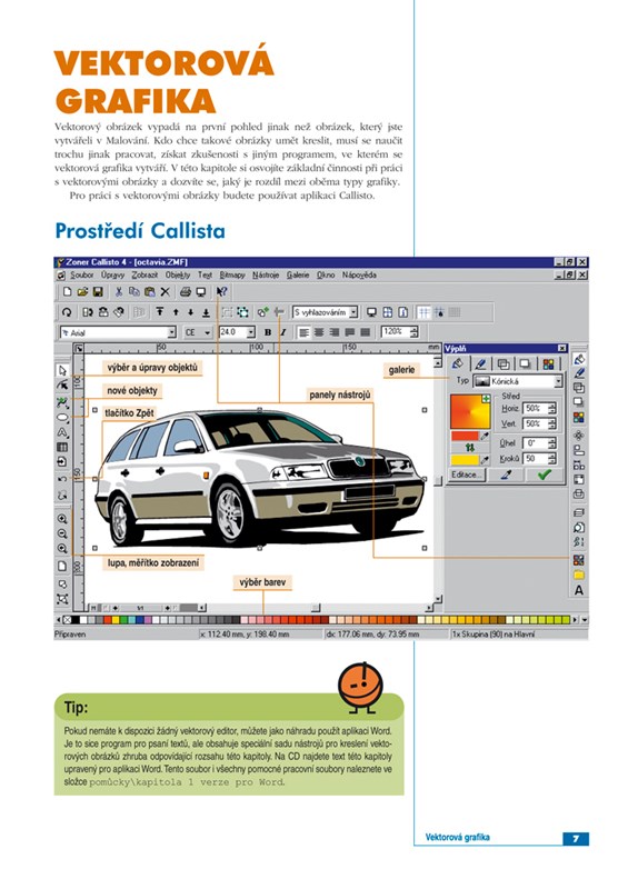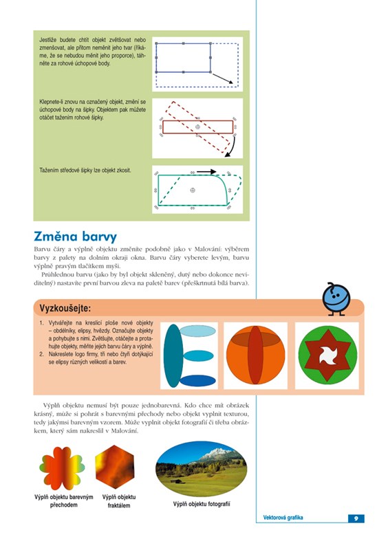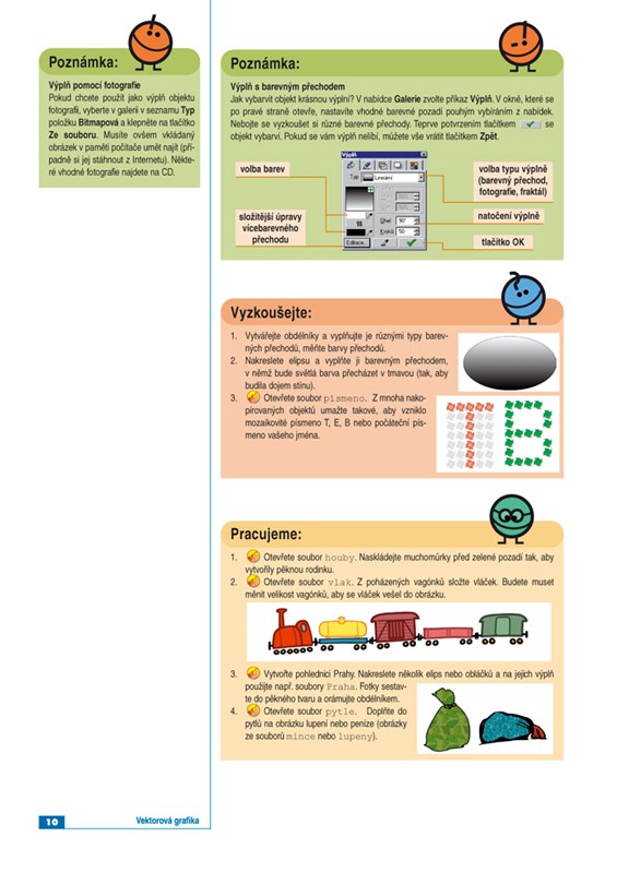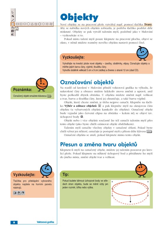 Naučíte se kreslit složitější a hezčí obrázky pomocí opravdového grafického editoru, který dovoluje tvar nakreslených čar dodatečně měnit a skládat obrázek z jednotlivých nakreslených dílků. Budete pracovat s vektorovou grafikou.