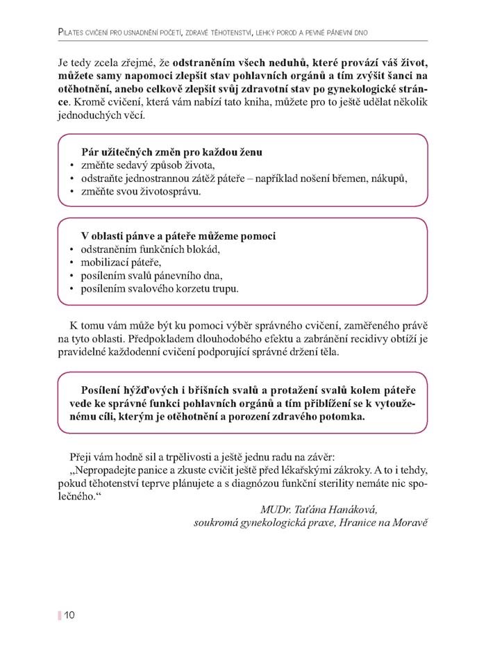 Jste úplně zdravá a přesto se vám nedaří otěhotnět? Zkušená lektorka metody Pilates, Mgr. Renata Sabongui, uznávaná v ČR i ve světě, pro vás sestavila unikátní řadu cvičení, které podobně jako rehabilitační cvičení nebo břišní tance pomáhají zpevnit svalstvo pánevního dna a zharmonizovat poměry v bederní oblasti a pánvi, čímž se zlepší podmínky pro přirozené početí. Zpevnění pánevního dna vám také přinese další výhody – intenzivnější zážitky v sexu, zdravé těhotenství, snadnější porod, po porodu rychlejší návrat do původní formy.
