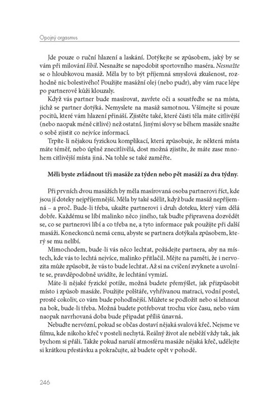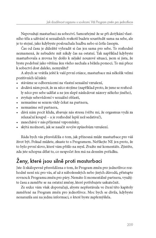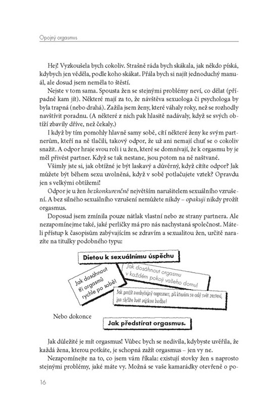 Toužíte po větším sexuálním uspokojení? Chcete zažívat opojný orgasmus, ale stále to není ono? Nebo dokonce nezažíváte vůbec nic? Kniha vám čtivou a vtipnou formou podává ucelený obraz ženských milostných rozkoší, sexuálních spouštěcích mechanizmů, fází vzrušení, vlivu psychiky i rozdílnosti mužů a žen. Zkušená klinická psycholožka a sexuoložka, doktorka Vivienne Cass odhaluje všechny možné příčiny ženských orgasmických potíží, a radí, jak se s nimi vypořádat. Tato příručka není pouhým „manuálem“, ale je zejména psychologickým rádcem, neboť intenzita sexuálního prožitku ženy záleží z velké části na psychice a kvalitě vztahu.