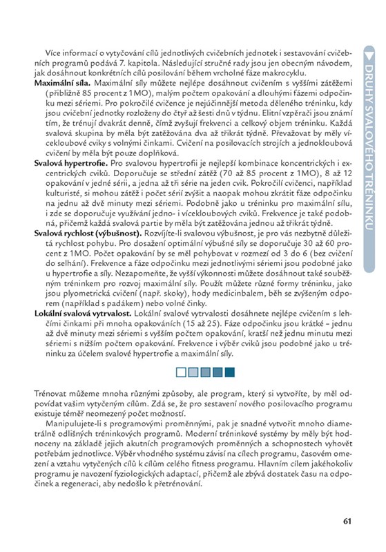 - Pravidla posilovacího programu – jak si určit své vlastní tréninkové dávky, typy posilovacích cvičení, jak přizpůsobit proměnlivé složky tréninku, abyste dosáhli maximálních výsledků.