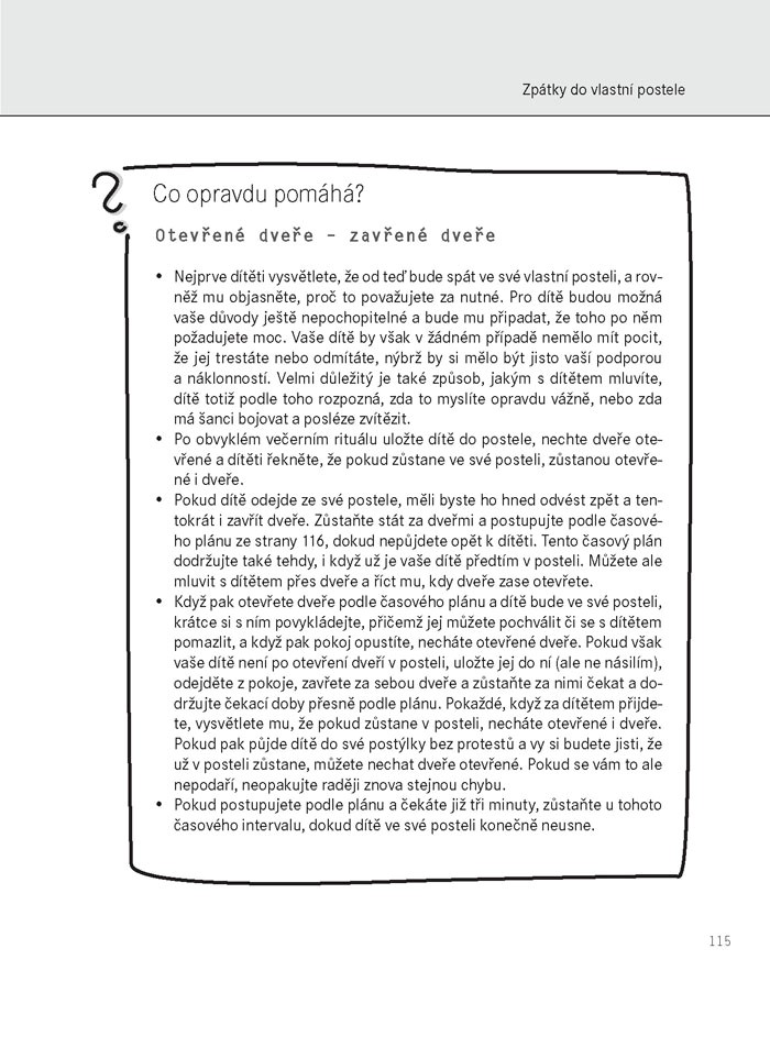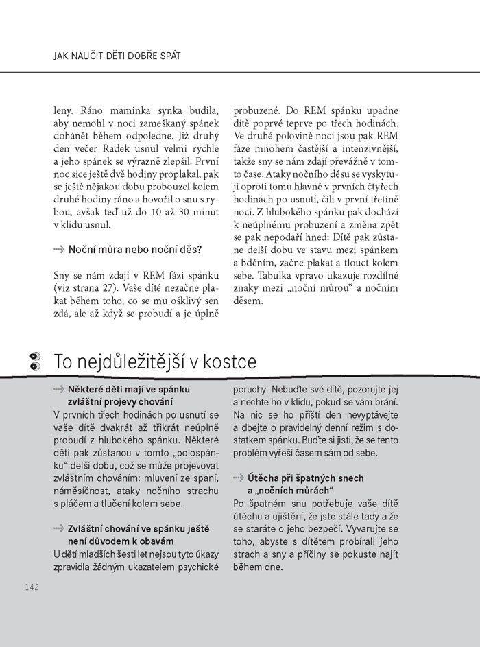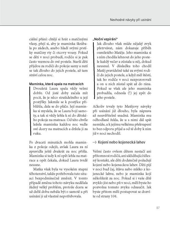 Budí se vaše dítě mnohokrát za noc nebo vstává a viditelně ožívá již v pět hodin ráno? Nemůže večer usnout, případně vymýšlí všemožné důvody pro to, aby nemuselo zůstat v posteli? Nebojte se, není to jev, se kterým se musíte po dobu několika let smířit! Tato kniha vás naučí jednoduchým a účinným metodám, jak naučit dítě dobře spát a případně jak ho naučit spát v době, kdy to vyhovuje i vám. V knize naleznete: