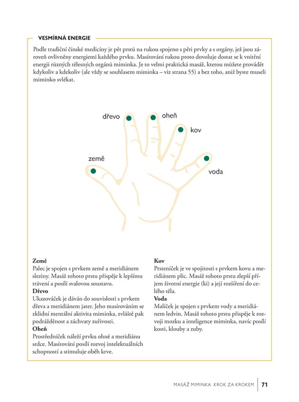 Naleznete v ní též mnoho jemných masážních hmatů, vhodné polohy pro masáž miminek i větších dětí, doporučené druhy esenciálních olejů, rady pro partnera, jak masírovat budoucí maminku, jak masáží pomáhat při porodu a po něm, a mnoho dalších užitečných informací.
