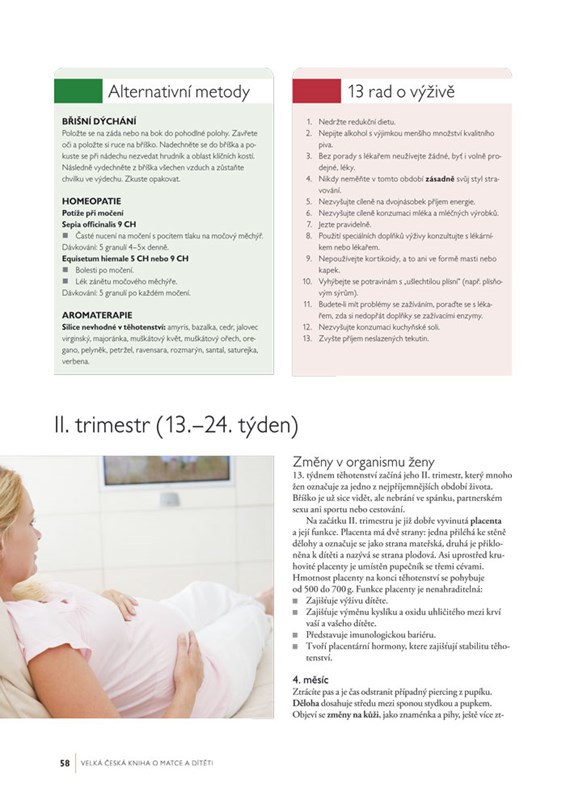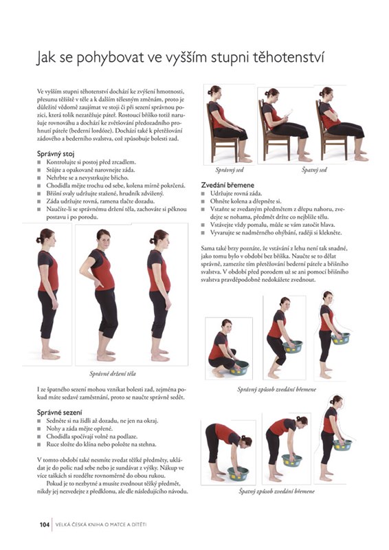 - Doporučené pohybové aktivity v těhotenství, výživu, potravinové doplňky, možnosti oblékání, jak a zda cestovat, pomůcky, přírodní prostředky a způsoby ulevující těhotenským obtížím.