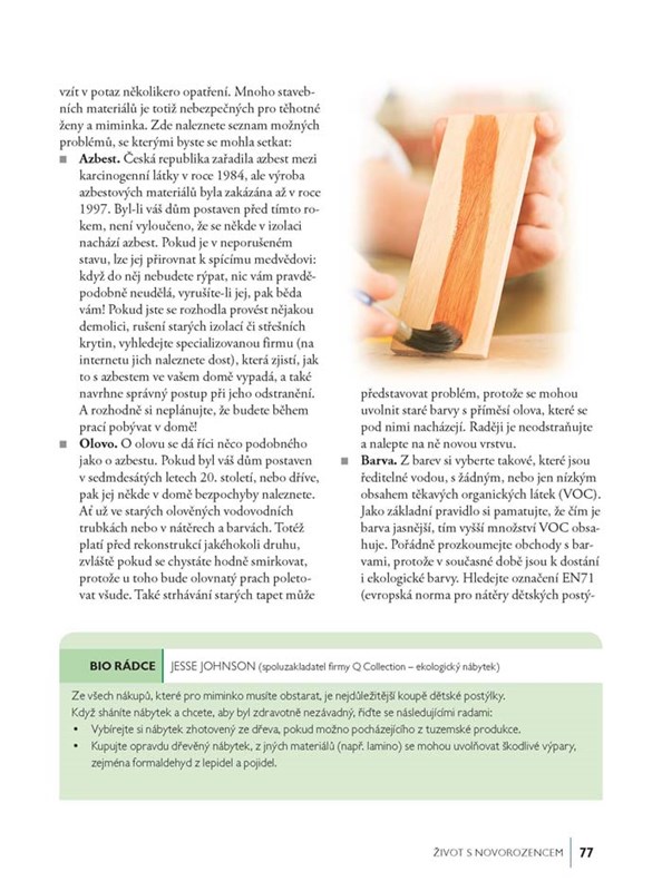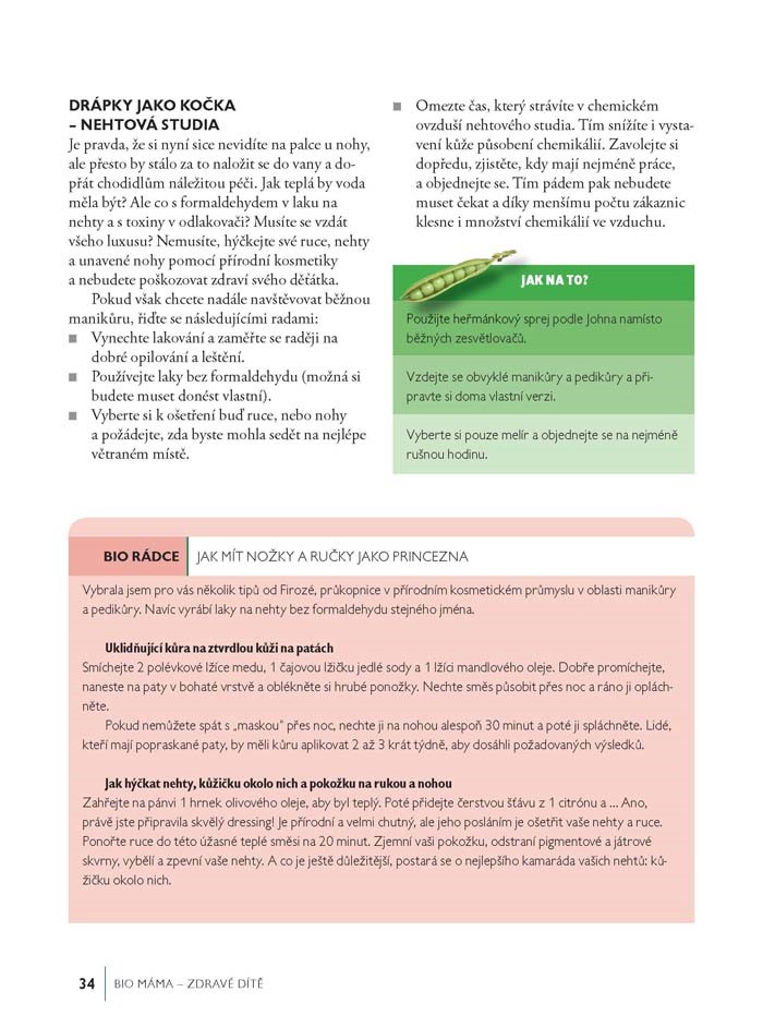Naleznete také několik receptů na chutné a zdravé pokrmy z bioproduktů, doporučení na konkrétní výrobce kosmetiky a oblečení, na jejichž zdravotní nezávadnost se můžete spolehnout, srovnání výhod a nevýhod jednorázových plenek s látkovými. Seznámíte se s pravidly ekologického zemědělství, takže se dozvíte, proč jsou biopotraviny zdravější. Naučíte se uspořádat večírek pro přátele v duchu vstřícném k životnímu prostředí, budete umět uvázat indiánský šátek, abyste mohla dítě nosit na svém těle a přečtete si, co udělat pro to, abyste si vyzkoušela život na ekologické farmě.