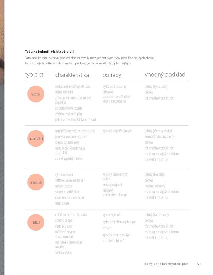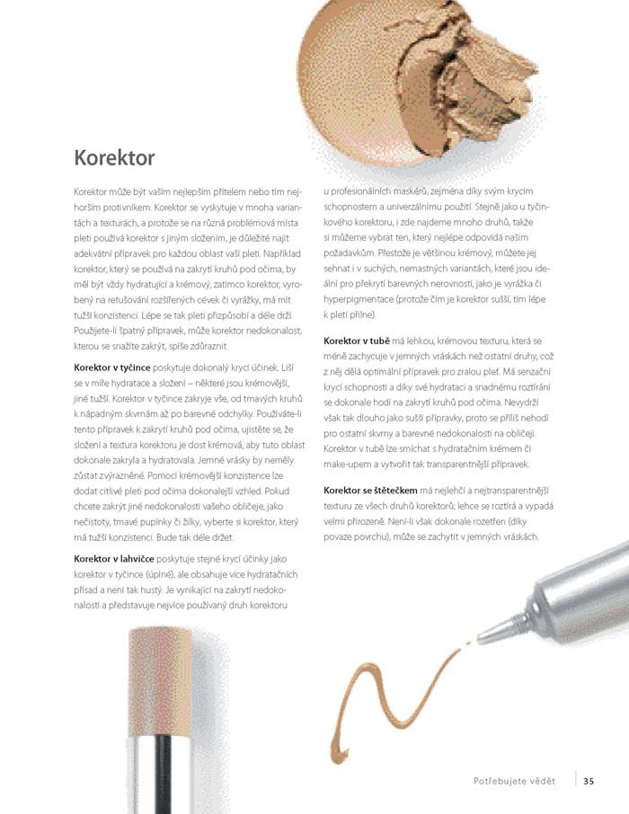 - jednoduché postupy, jak zakrýt linky úsměvu, povislá oční víčka, skvrny, vyrážky a vrásky,