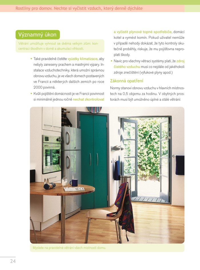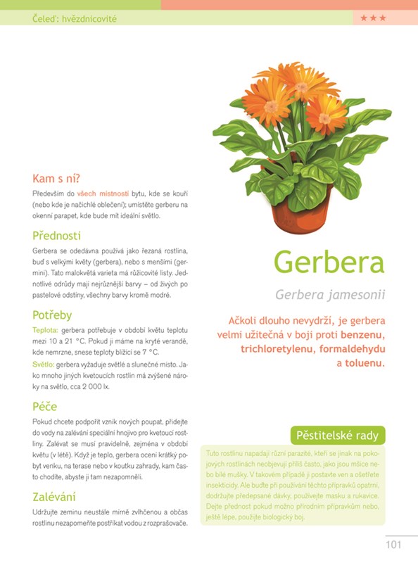 Víte, že existují rostliny, které dokážou nejen zkrášlit vaše bydlení, ale mají také blahodárné účinky na naše zdraví, protože vylepšují vzduch v místnostech? Knížka nabízí výběr 38 běžných druhů pokojových rostlin, které umějí čistit a regenerovat vzduch v našich domovech. Mají schopnost pohlcovat látky škodlivé našemu zdraví, jako jsou těkavé organické sloučeniny a jiné chemické látky uvolňující se z materiálů používaných pro zařízení bytu. Pro každou místnost bytu zde najdete seznam druhů vhodných k boji se škodlivinami, které se v ní mohou vyskytovat.
