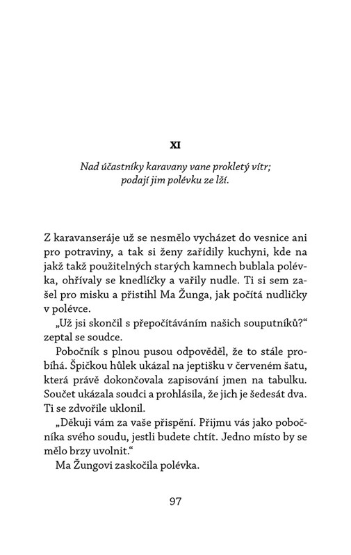 Soudce Ti putuje se svojí První manželkou nehostinnými a nebezpečnými končinami svého kraje, kam ho zavedla jeho funkce výběrčího daní. Aby unikli hrozivým tygrům a strašidelným nástrahám, připojí se ke karavaně, v níž se setkají s obchodníky, prostitutkami a dalšími zajímavými postavičkami. Mezi cestujícími však začne docházet k záhadným úmrtím, počínaje císařovým tajným vyslancem. A cesta vůbec neprobíhá hladce. Soudci Ti nezbude než se na vlastní pěst pokusit rozluštit tajemství, které se za hrůzami skrývá.
