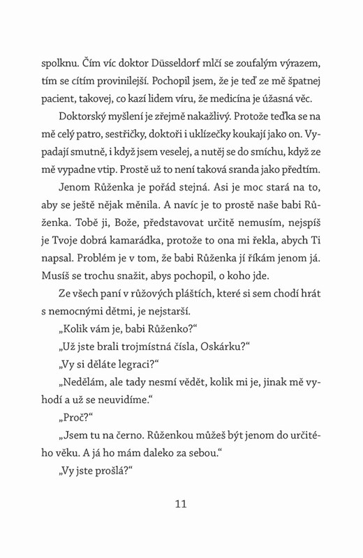 V souboru tří dojemných příběhů autor formou jednoduchého, dětského vyprávění vykresluje paralely i kontrasty mezi náboženskými systémy (křesťanstvím, judaismem, islámem) a dokazuje, že vždy by měla rozhodovat v první řadě lidskost. V příběhu Oskar a růžová paní vede umírající desetiletý Oskar kouzelný dialog se svou ošetřovatelkou o hodnotách lidského života a rozhodne se napsat Bohu. V části Pan Ibrahim a květy Koránu se ujímá osiřelého židovského chlapce starý muslim z jeho ulice a podnikne s ním cestu do své rodné země. V Noemově dítěti je hrdinou příběhu malý Josef, kterého společně s dalšími židovskými dětmi za války ukrývá katolický kněz. Zatímco děti musí chodit na mši do kostela, otec Pemza se učí hebrejsky a sbírá předměty patřící do dědictví národa, který stál před vyhlazením.