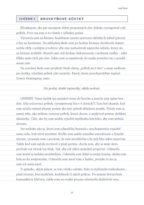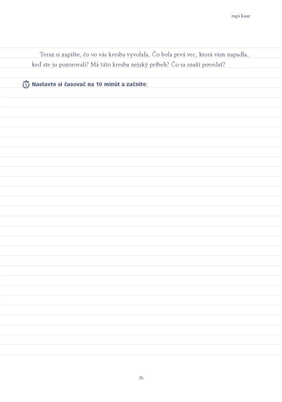Rupi Kaur predstavuje v tejto knihe riadené cvičenia na písanie, ktoré inšpirujú tvorivosť a pomáhajú pri uzdravení. Tieto cvičenia vám pomôžu preskúmať témy traumy, straty, bolesti srdca, lásky, uzdravenia a oslavy vlastného ja. Nemusíte byť spisovateľ, stačí, ak chcete písať, spoznať svoje vnútro, prijať svoju zraniteľnosť a byť úprimní.