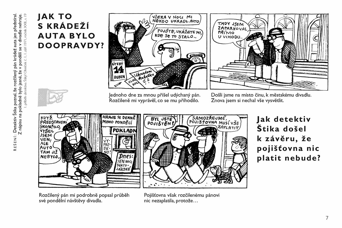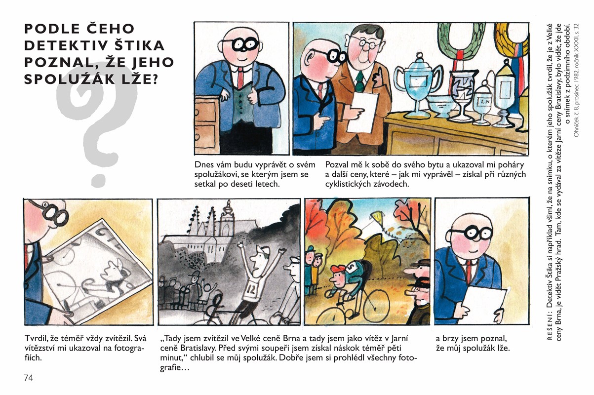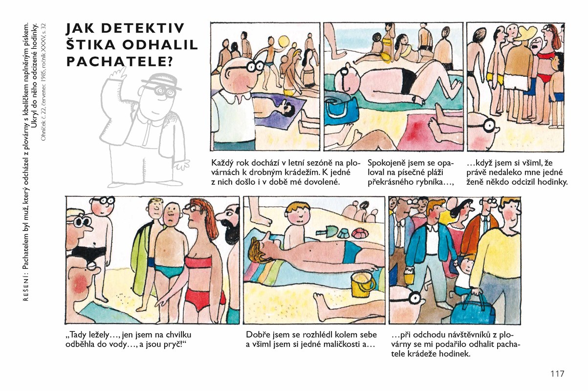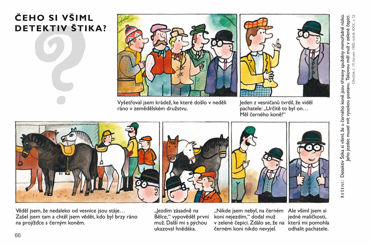 Otazníky detektiva Štiky patří mezi komiksy, které si oblíbilo hned několik generací čtenářů. Komiks o obtloustlém detektivovi, který řeší zapeklité případy, a úlohou čtenářů je odhalit jejich řešení, vycházel více než deset let v časopise Ohníček. Významný malíř Jiří Kalousek kreslil detektiva nejdřív černobíle, později i barevně. V naší knize je výběr z více než 350 komiksů, při výběru jsme se opírali především o dochované originály. Kniha je určena pamětníkům časopisu Ohníček, ale stejně tak potěší i současné děti, protože veselý detektiv s tlustými obroučkami je stále populární a oblíbený.