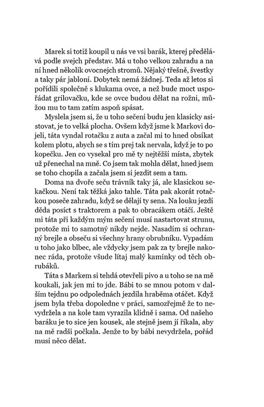 Je vůbec v jednadvacátém století a zároveň v tak uspěchaném světě možné, aby si byly dvě dospělé ženy s věkovým rozdílem čtyřiceti pěti let tak blízko? Dnes, kdy se většina mladých lidí zajímá především o svůj vlastní život a staří lidé mají rádi přece jen svůj klid? Anna je ve věku, kdy by si měla někoho najít a začít plánovat rodinu, jenže ona chce svůj čas trávit s bábi Jarkou. Humorně vyprávěný příběh z jedné vesnice na Vysočině, kde se ještě pořád dělají sena, otavy, zavařuje se všechno možné ovoce nebo se pořádají zabíjačky králíků a holubů. Bábi Jarka se jen rozčiluje, že se Anna nechce začít učit péct ty její buchty, když čas přitom letí tak rychle.