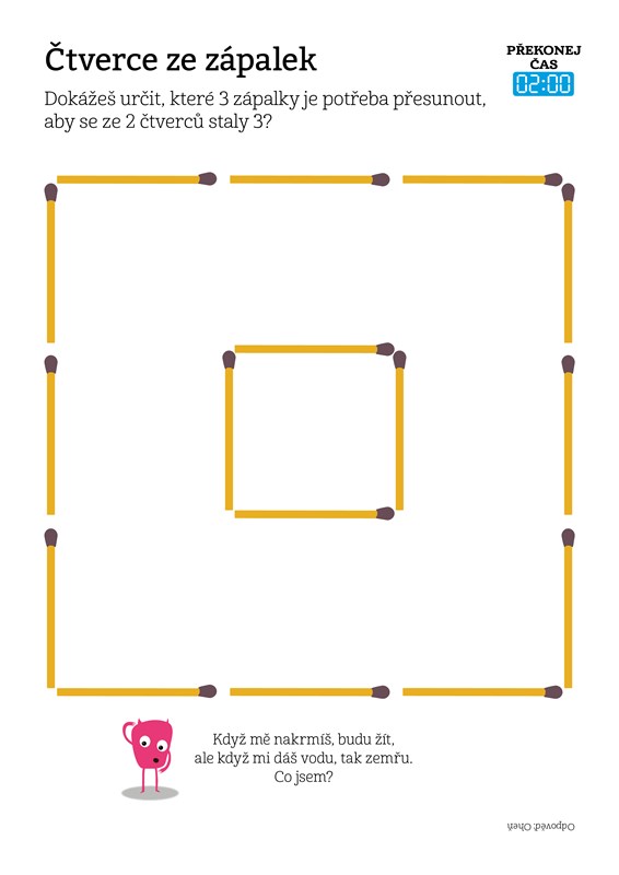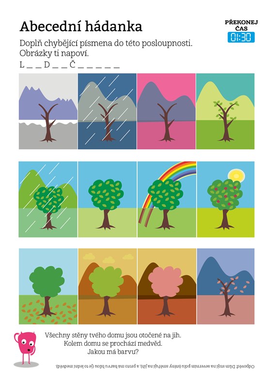 Každá stránka obsahuje informaci o čase dostatečném k nalezení odpovědi, který se ale určitě pokus překonat. Při luštění můžeš psát přímo do sešitu nebo si určité tvary vybarvit. Neboj se stránky pořádně pomalovat, hlavně když se ti podaří úkol rozluštit.