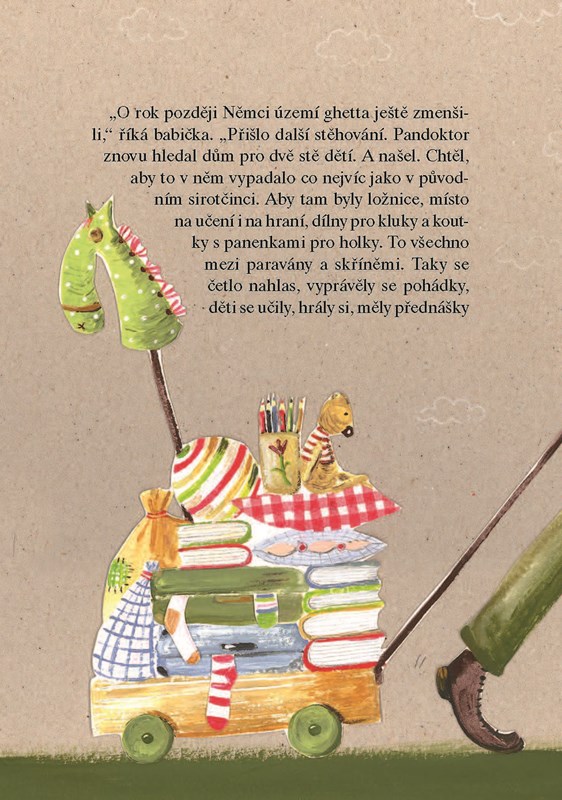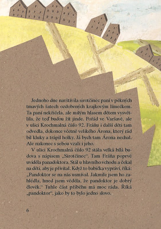 V ulici Krochmalná číslo 92 stála velká bílá budova s nápisem Sirotčinec. Tam Fráňa poprvé uviděla panadoktora. Stál u hlavního vchodu a čekal na děti, aby je přivítal. Když to babička vypráví, říká: „Pandoktor se na nás usmíval. Jakmile jsem ho zahlédla, hned jsem věděla, že pandoktor je dobrý člověk.“ Tuhle část příběhu má moc ráda. Říká „pandoktor“, jako by to bylo jedno slovo.