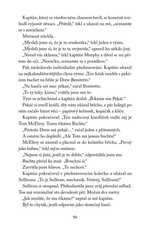 Co mi tady hodně vadilo byl vlastně ten romantický vztah. Chybělo mi tady to vzájemné pošťuchování (jako ono tam trochu bylo, ale v hodně malé formě) Chybělo mi, že se tady ten vztah pořádně nevyvíjel a přišlo mi, že se všechno nakonec událo strašně rychle. Ráda bych si přečetla víc konverzací mezi hlavními hrdiny, a hlavně víc náznaků, že ji hlavní mužský protagonista taky má rád. Chápu, že to museli skrývat, protože se nehodí, aby v takové práci řešili milostný vztah a nechávali se rozptylovat, ale tohle mi tam prostě chybělo. Ale na druhou stranu chápu, že tady nejvíce šlo o tu profesi a ukázat, že opravdu i žena může být dobrá hasička a že dokážete všechno, co si přejete. Stačí na sobě jen tvrdě makat a nebát se předsudků a toho, co si o vás bude kdo myslet.