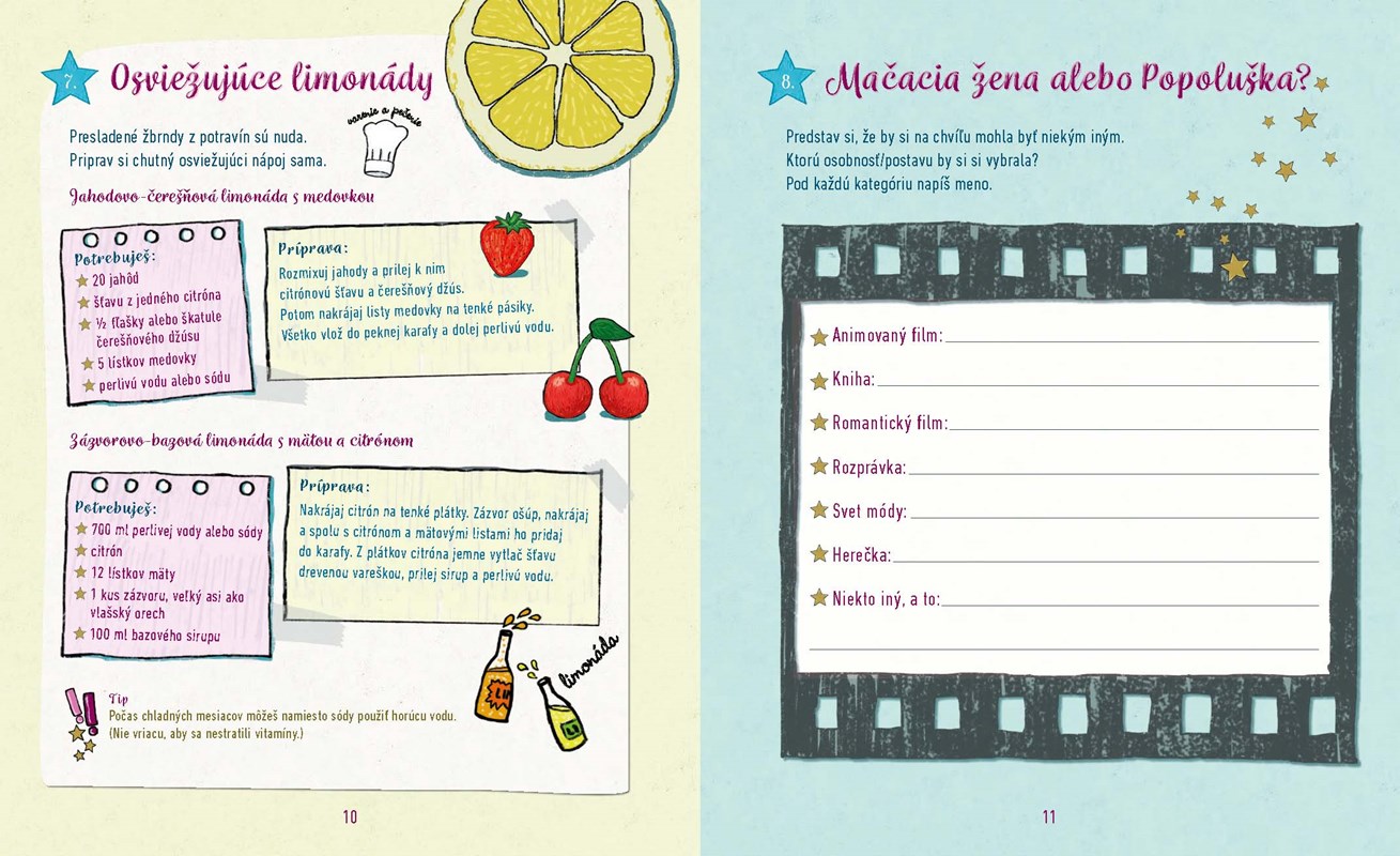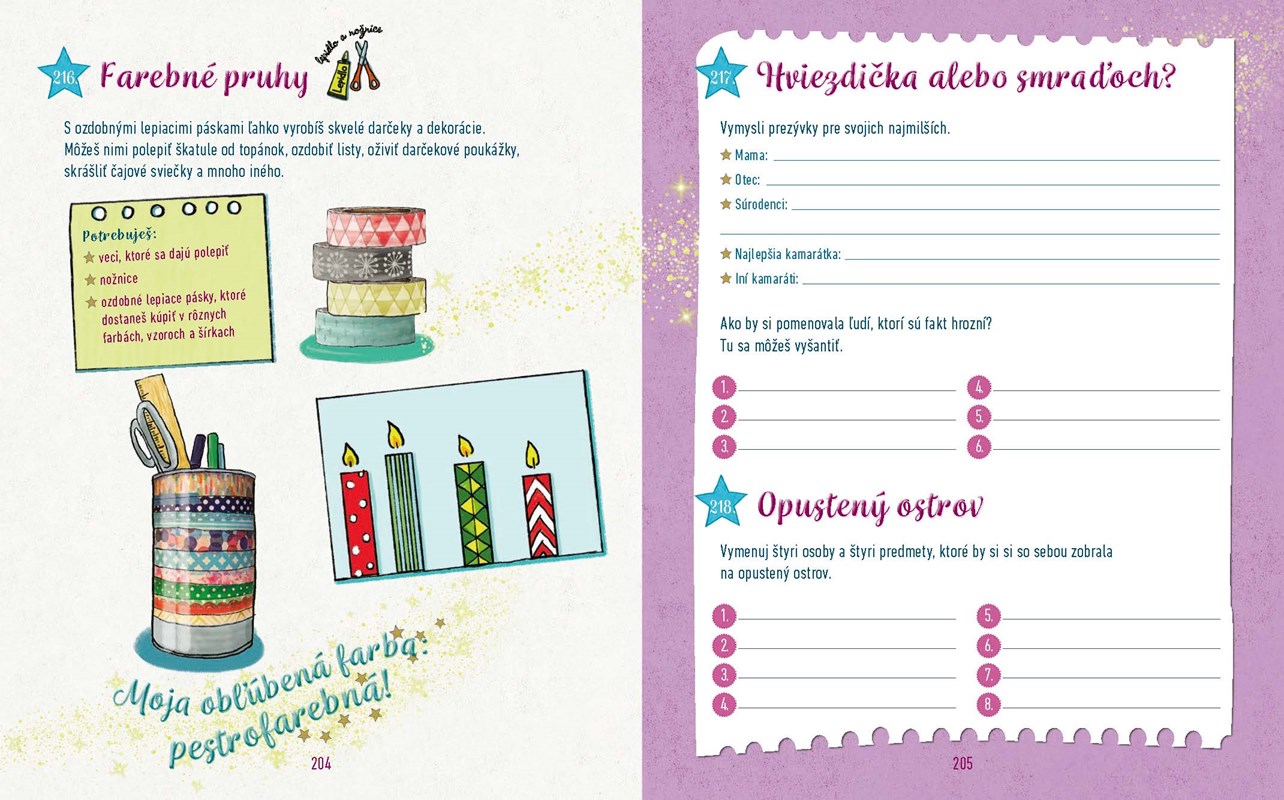 Táto kniha obsahuje viac ako 230 kreatívnych nápadov na domáce aktivity, ktoré zaručene rozžiaria tvoj každodenný život. Obsahuje osobnostné testy, relaxačné cvičenia jogy, skvelé výroky a zaujímavé fakty, tipy na dokonalý deň s priateľkou, chutné recepty, módne rady a mnoho ďalšieho!