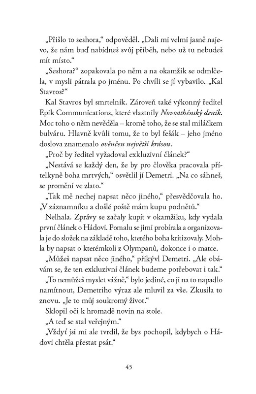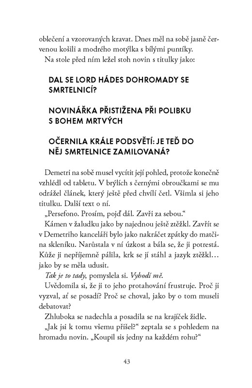 Persefonin vztah s Hádem se provalil. Následná mediální smršť ji připravila o veškeré naděje na normální život – teď může kdokoli zjistit, že je bohyní jara. Hádova temná minulost skrývá mnoho kostlivců ve skříni, jejichž odhalení by vše mohlo ještě zhoršit. A do toho Persefonu zasáhne nečekaná tragédie. Tváří v tvář dosud nepoznané bolesti objevuje Hádovu odvrácenou tvář, o níž dosud neměla tušení. Do mysli se jí začíná vkrádat neodbytná otázka: Opravdu by se měla stát jeho královnou?