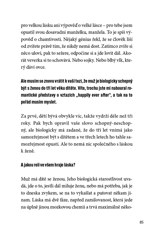Otázek, na které v knížce Radkin Honzák odpovídá, je mnohem víc. Všechny se točí okolo žen a mužů a jejich vzájemných vztahů. S lehkostí sobě vlastní přemýšlí psychiatr o situacích, které se týkají každého z nás.