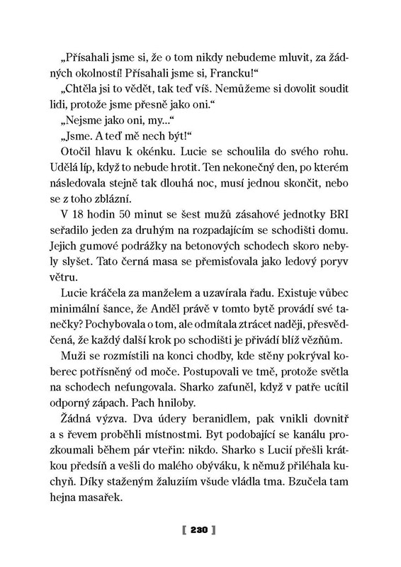 Moderní technologie jsou všude… a děs jim jde v patách jako stín. Sharkův tým se potýká se zlověstnými událostmi. Těhotná mladá žena, která za vysokou cenu pronajala svou dělohu bezdětnému páru, hned po svém příjezdu do hotelu zmizí z pokoje. Na dně jámy vykopané v lese je nalezeno zohavené tělo. Policii uniká muž, který zná den i hodinu své smrti. A nakonec přijde dopis, zlověstný manifest zkázy. Franck Sharko a Lucie Hennebellová se pouštějí do temného závodu. Hodiny tikají, peklo právě přichází.