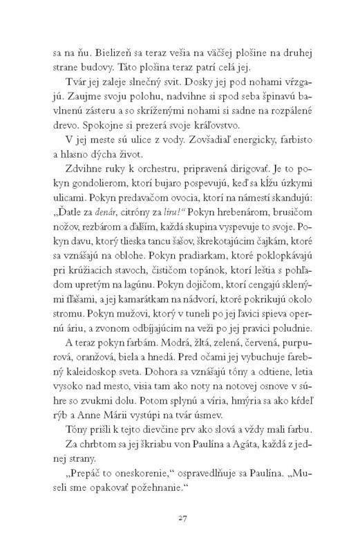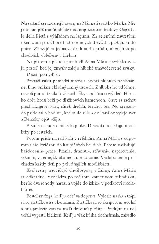 Úžasný román o hudbe, opojení a o zrade, inšpirovaný skutočným príbehom Anny Márie della Pietá, benátskej siroty a husľového zázračného dieťaťa. Študovala u Antonia Vivaldiho a napokon sa stala hviezdnou hudobníčkou a jeho najväčšou múzou.