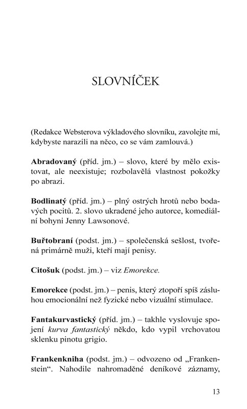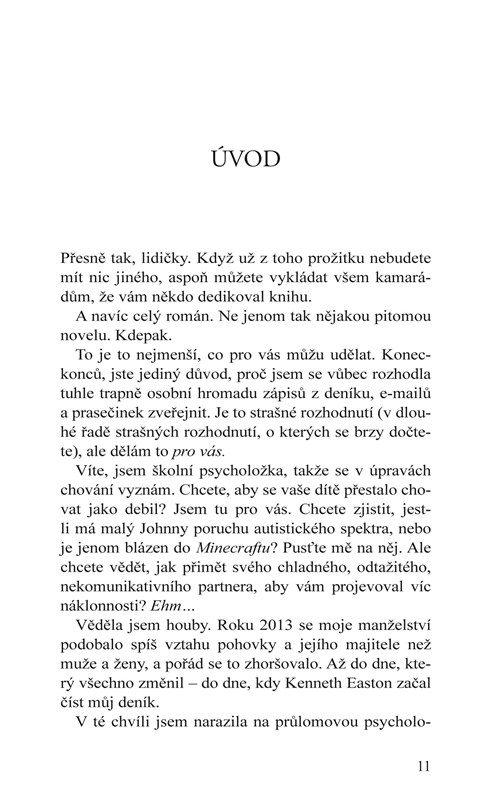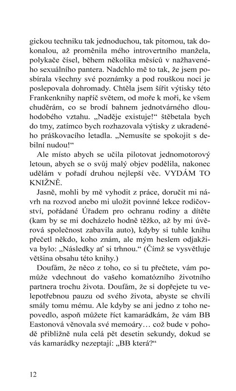 Léta jsem se snažila zpestřit svůj sexuální život, až jsem to nakonec vzdala a spokojila se s deníčkem. Možná můj nádherný, chladný manžel-cifršpion jednoduše nebyl schopný takové vášně, jakou jsem očekávala. Koneckonců, moji bývalí – tatér, později mariňák, později vyvrhel z motorkářského klubu, punk-rocker s tváří nevinného děcka, propuštěný z vězení na podmínku, a heavymetalový basák – byli nachlup stejně tetovaní a nabití testosteronem jako hrdinové mých oblíbených romancí. Když už nemůžu znovu prožívat takovou vášeň v reálném životě, můžu o ní aspoň psát. Ne? Nikdo se o tom nemusí dozvědět. Bude to moje malé tajemství.