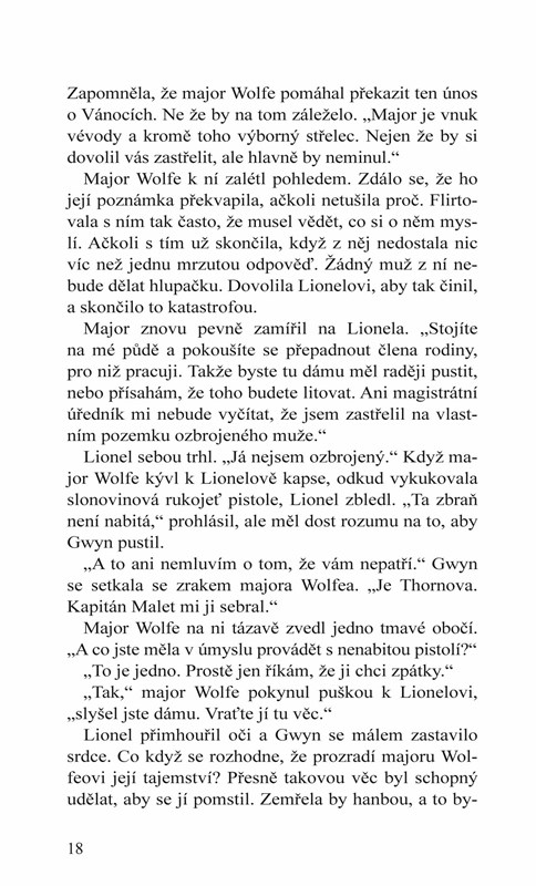 To se však změní, když ho její bratr, vévoda z Thornstocku, zaměstná jako osobního strážce, který má na ni dávat pozor během jejího společenského debutu v londýnské vyšší společnosti. Lady Gwyn totiž zřejmě ohrožuje její bývalý ctitel kapitán Malet, který si už kdysi nechal zaplatit za to, že se jí vzdá, ale při trvalém nedostatku peněz znovu uvažuje o tom, jak by ji mohl využít pro své nekalé účely.