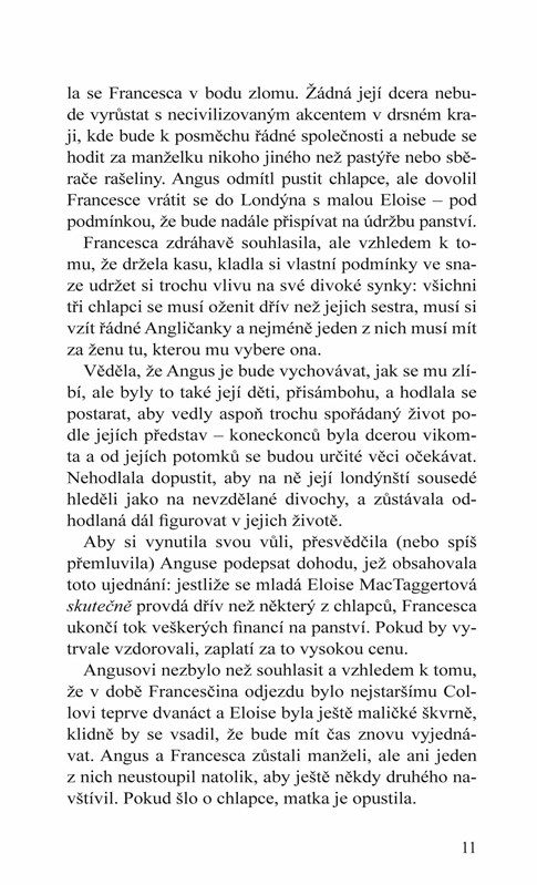 Drsný, ošlehaný skotský horal Niall MacTaggert a jeho bratři znají pravidla: nejstarší se musí oženit, jinak ztratí panství svých předků, a tečka. Jenže Niallův nejstarší bratr prostě nemá zájem o dámu, kterou mu matka vybrala za nevěstu. Je to tím, že Amelia-Rose je příliš… volnomyšlenkářská? Ano. Drzá? Ano. Niall určitě dokáže najít způsob, jak umírnit dívku s ostrým jazykem a v zájmu rodiny ji proměnit v ideální partii pro svého bratra.