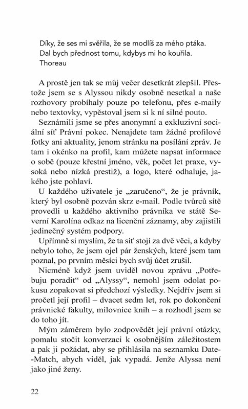 Aspoň to tak bylo, než poznal Alyssu. Domníval se, že je vystudovaná sedmadvacetiletá právnička a zcela neatraktivní sběratelka knih. Pozdě v noci se spolu radili o právních záležitostech a Andrew se jí s důvěrou svěřoval se svými milostnými eskapádami.