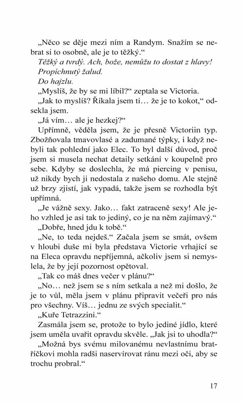 Člověk by neměl toužit po někom, kdo ho mučí. Můj nevlastní bratr Elec se k nám přestěhoval, když jsem byla v posledním ročníku na střední, a já jsem absolutně nebyla připravená na to, co za pitomce se z něho vyklube. Zuřila jsem, že si svoji zlost vybíjel na mně, protože tu s námi nechtěl být. Zuřila jsem, že si do svého pokoje vodil holky ze střední.