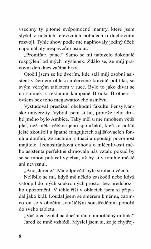 Můj život měl řád. Byl předvídatelný a hladký jako moje skotská. Měl jsem se ženami milostné poměry, jež měly předem jasně definovaný začátek a konec. Neměl jsem zájem o žádné romantické vztahy.