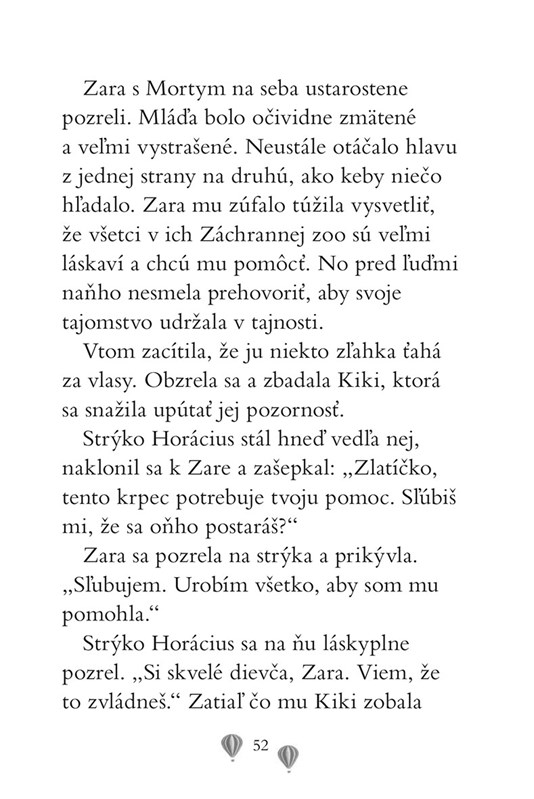 veterinárka, sa mu snažia pomôcť a vytvoriť čo najlepšie podmienky, aby sa u nich zabývalo. Zara navyše veľmi dobre vie, čo má robiť, pretože rozumie reči zvierat a zvieratá