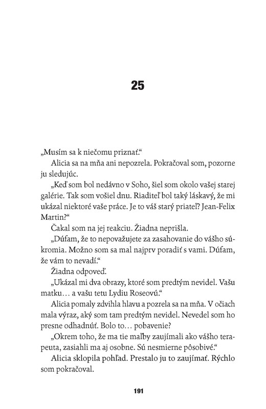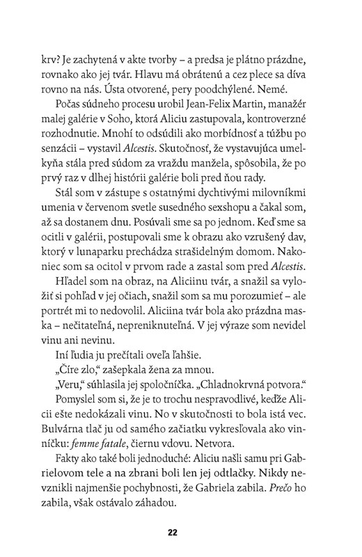 Alicia Berensonová má napohľad dokonalý život. Je známa maliarka, vydatá za vychyteného módneho fotografa, ktorého nadovšetko miluje, a býva v nádhernom dome obklopenom zeleňou v luxusnej štvrti Londýna. A predsa jedného večera z neznámych príčin svojho muža chladnokrvne zavraždí. Do hlavy mu vypáli päť rán a odvtedy neprehovorí.