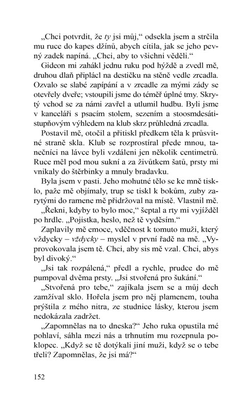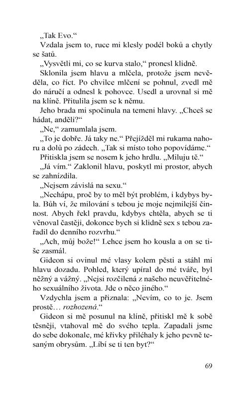 Jiskří to mezi nimi stále víc… Jedna z nejromantičtějších a nejerotičtějších knih nového tisíciletí má další, již třetí, pokračování. Vášnivé milostné scény a fascinující příběh nevšední lásky Evy a Gideona udržují čtenáře v napětí a probouzejí v nich touhu dozvědět se o hlavních hrdinech víc a víc. … Chtěl by mě zkrotit a já se podřizuji jeho autoritě, ale když přijde na věc, dokážu se mu vzepřít a přinutit ho, aby se, alespoň na chvíli, poddal on mně. Mluvím o nejintimnějších chvílích našeho života, kdy jsme spolu jen on a já. O chvílích, kdy se rádi necháme jeden druhým zkrotit výměnou za nepředstavitelnou rozkoš…