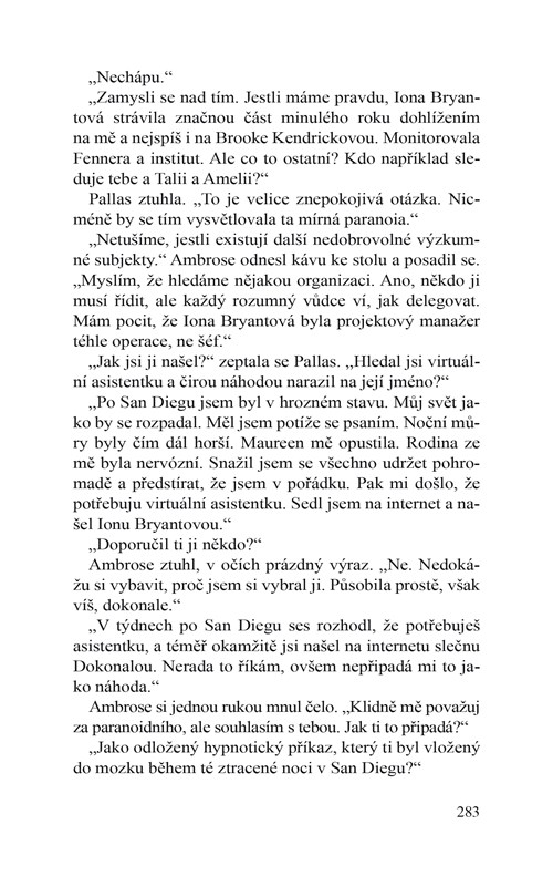 Ambrose Drake si je jistý, že se stal svědkem vraždy, ale jelikož nemá žádný důkaz, všichni si myslí, že jen trpí halucinacemi způsobenými extrémní spánkovou deprivací. Ambrose však ví, že se v Carnelianském spánkovém institutu stalo něco strašného tu noc, kdy tam byl. Sám však nedokáže najít žádný důkaz, a tak požádá Pallas o pomoc. Vzápětí Pallas zjišťuje, že i Ambrose přišel o noc, na kterou si nedokáže vzpomenout – a která možná nějak souvisí s tím, co se stalo Pallas.