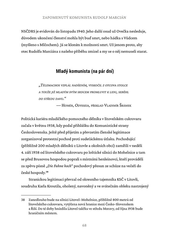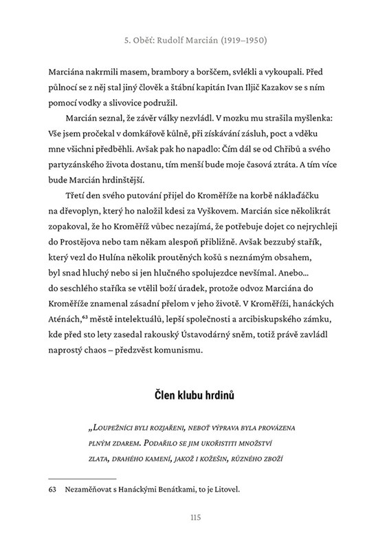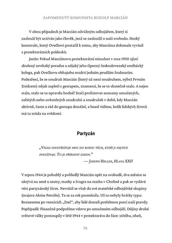 Toto je příběh života krajského tajemníka KSČ v Olomouci, soudruha Rudolfa Marciána. Že vám o něm v hodinách dějepisu nic neřekli? Škoda, protože jeho život odráží turbulence první poloviny 20. století. Litovelský rodák Marcián (*1919) byl v roce 1938 pár dní komunistou, aby poté „pomáhal“ uprchlíkům z pohraničí, za protektorátu bojoval jako partyzán a sloužil coby konfident. V létě 1945 se vynořil v Kroměříži, kde se stal nohsledem urputného bolševika a zlotřilého psychopata JUDr. Alexeje Čepičky. Pod jeho ochranou stoupá nomenklaturou až na pozici krajského tajemníka a otevírají se mu dveře na pražské ministerstvo…