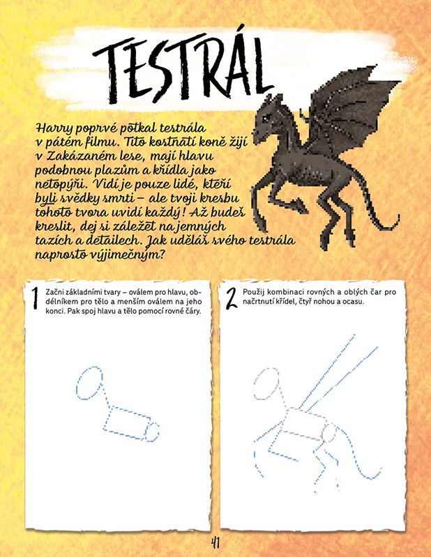 Stránky téhle příručky jsou přímo napěchované srozumitelnými postupy, které tě krok po kroku povedou až k perfektním kresbám. Kromě ústřední trojice, tedy Harryho, Rona a Hermiony, jejich spolužáků, Dobbyho nebo profesora Brumbála se naučíš ztvárnit také spoustu kouzelných předmětů nebo tvorů. Pod rukama ti ožijí testrálové, hipogryfové, Aragog, nebo dokonce celý bradavický hrad!