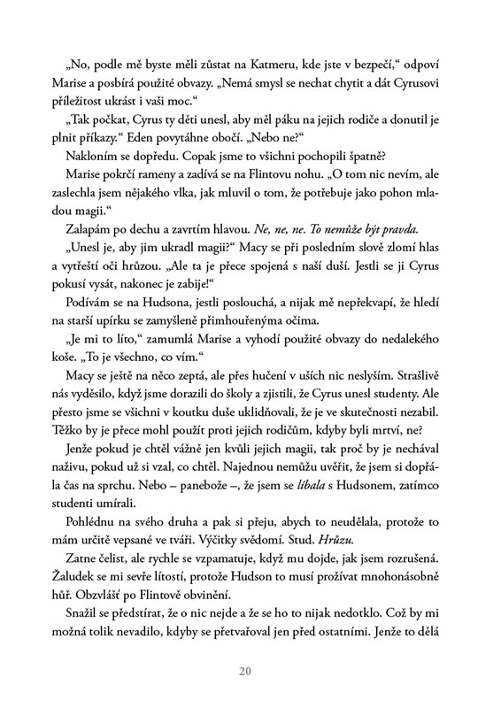 Poslední bitvu nikdo nepřežil bez úhony. Flint je naštvaný na celý svět, Jaxon se mění v něco, co nepoznávám, a Hudson si postavil zeď, kterou zřejmě nikdy neprolomím. Blíží se válka a my nejsme připraveni. Navíc jsou tu neodbytné otázky o mém původu, na které musím najít odpovědi. Není jisté, že až bude po všem, zůstane vůbec někdo naživu. Pokud ale chceme tento svět zachránit, nemám na výběr. Budu muset přijmout každou svou část... i tu, které se bojím ze všech nejvíc.