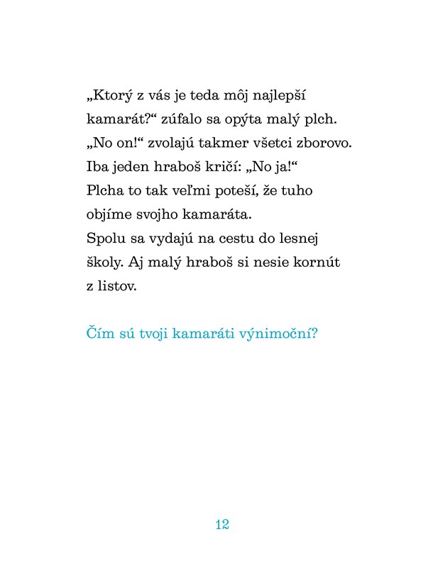 Malý plch je veľmi rozrušený, lebo dnes ide prvý raz do školy! Našťastie tam pôjde so svojím najlepším kamarátom hrabošom. Obaja si nesú ťažké kornúty plné maškŕt a spolu sa vyberú do lesnej školy, kde na nich už čakajú spolužiaci a pani učiteľka sova. Počas hodín sa naučia mnoho nového a zistia, čo ide ich spolužiakom najlepšie.