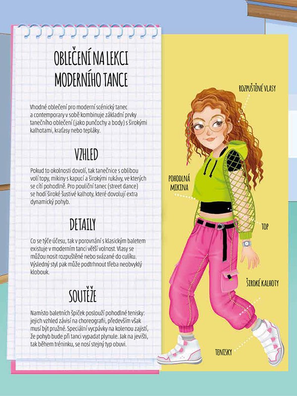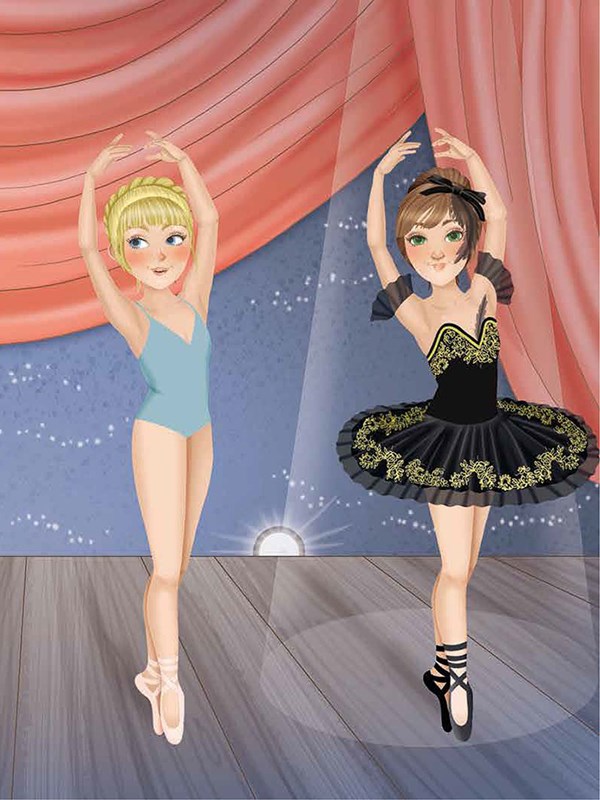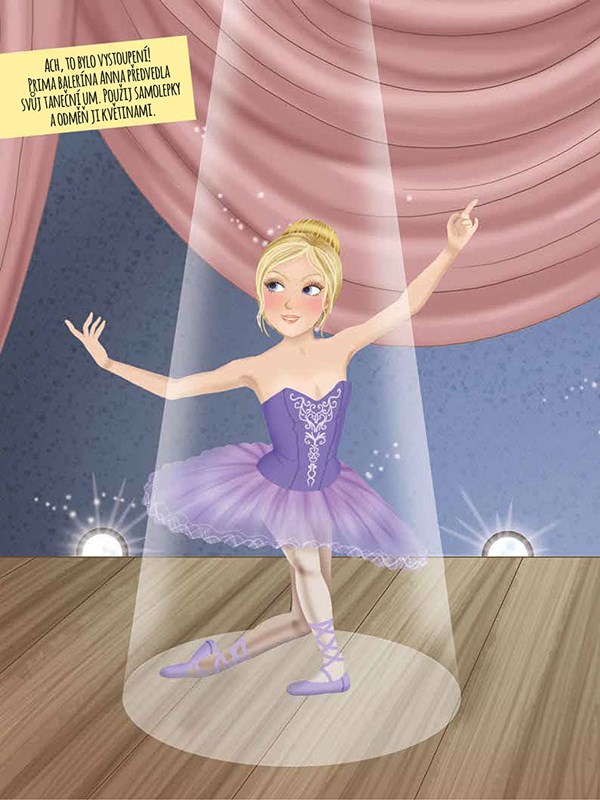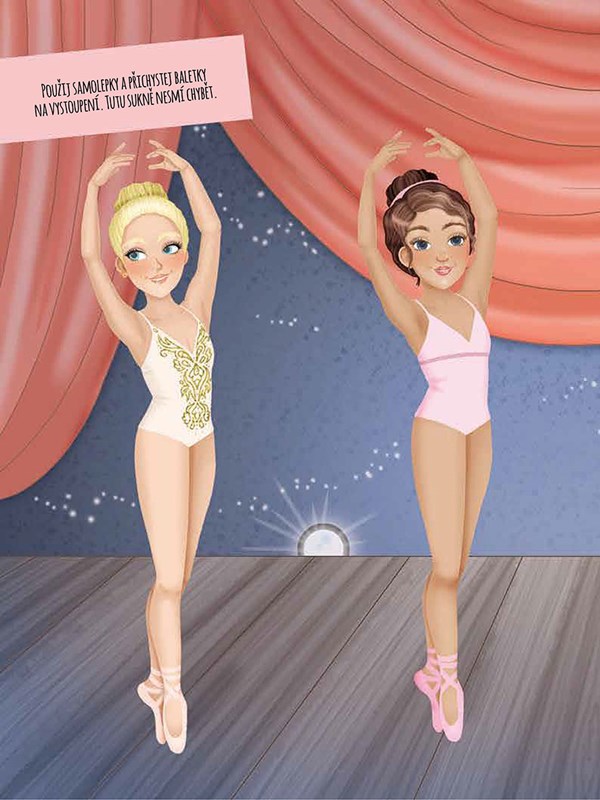 Baletní představení už každou chvíli začíná, avšak baletky v zákulisí stále ještě tápou, co si mají obléct. Použij stylové samolepky a pomoz jim vybrat krásné kostýmy, v nichž na jevišti zazáří. V dnešní době však neletí jen špičky a tutu sukně. V čem se tančí moderní tance? Sestav tanečnicím stylové oblečky na lekci hip-hopu a contemporary. Co si mají obléct, aby dokázaly na soutěžích zaujmout přísnou porotu? Sestav odvážné a moderní módní kombinace. Předveď svůj smysl pro módu!
