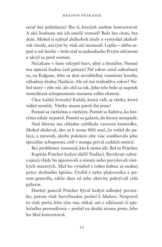 Nadácia upadla do područia mutanta Mula. A napriek tomu, že extrémne rýchlo dobyl nemalú časť vesmíru, stále to nepovažuje za dostatočné. Je presvedčený, že na to, aby dosiahol svoj cieľ, musí zničiť bájnu druhú Nadáciu. Národ, ktorý vraj na všetko historické dianie dohliada z bezpečnej vzdialenosti, ukrytý pred zvedavcami. Ťahá druhá Nadácia potichu za nitky osudu alebo je len rozmarom Hariho Seldona, tvorcu najodvážnejšieho záchranného plánu v dejinách ľudstva?