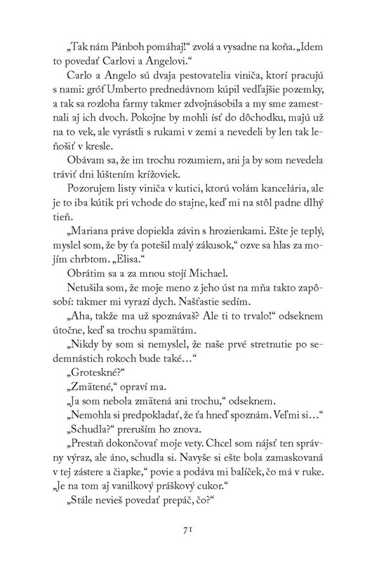 Elise je však hon na manžela úplne ľahostajný. V detstve trávila každé leto s oboma chlapcami na spomínanom panstve, kde teraz žije a s vášňou tam vyrába víno. Snaží sa prísť na to, čo bude s vinicou ďalej, pretože Charles a Michael prišli do Toskánska s nejasnými úmyslami.