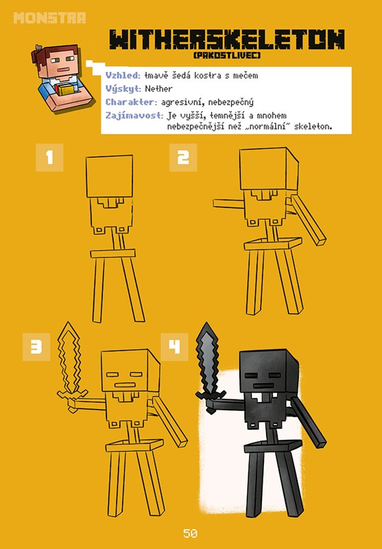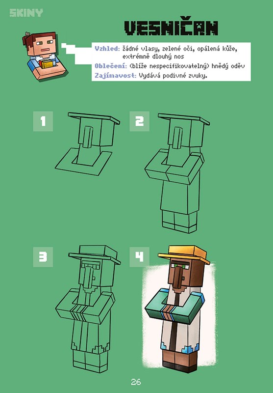 Tak hraní Minecraftu na mobilu nebo tabletu by ti šlo, ale co si zkusit nejznámější skiny, monstra, mutanty a zvířata třeba taky nakreslit? Neboj, není to žádná věda a díky téhle jedinečné kostičkované knize se ve 4 jednoduchých krocích naučíš tvořit fakt cool minecrafťácké obrázky! Navíc se o jednotlivých „postavách“ dozvíš také spoustu zajímavostí, o kterých jsi zaručeně ještě neslyšel, a nebudou chybět ani vtipné hlášky!