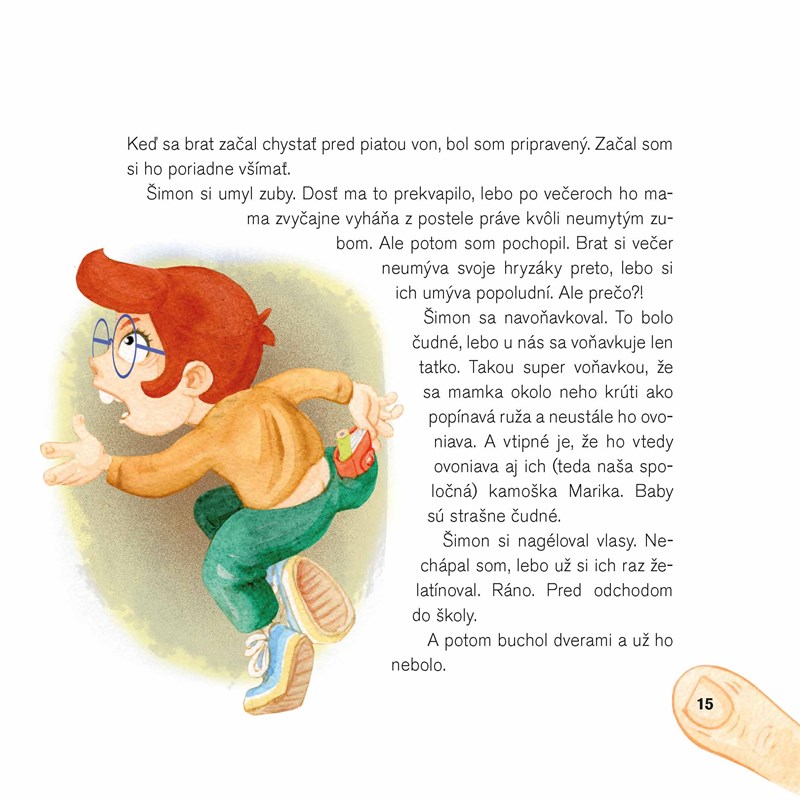 Čo to ten brat zase stvára? Aj mamka sa už strachuje – zrazu sa len sprchuje a voňavkuje ako dáka fiflena. Očko musí prísť celej veci na koreň! Vrhne sa do pátrania a zistí: kto ukradol bicykle, kto zničil v škôlke preliezky a, hrôza! – koho brat Šimon pobozkal. Pozerať sa na bozkávačov je síce fúúj, ale je rozhodnuté.
