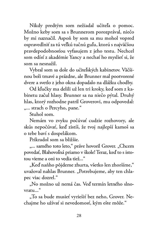 Zistil som však, že môj otec je jeden z hlavných bohov na Olympe, moja učiteľka sa premenila na krvilačnú príšeru a môj najlepší kamarát Grover je satyr! Odrazu na mňa číhajú kadejaké monštrá zo starých gréckych povestí a vládca bohov Zeus ma podozrieva, že som mu ukradol blesk - jeho najmocnejšiu zbraň. Aby som zachránil seba a celé ľudstvo, musím dokázať svoju nevinu a nájsť pravého zlodeja aj ukradnutý blesk. Pomôžeš mi?