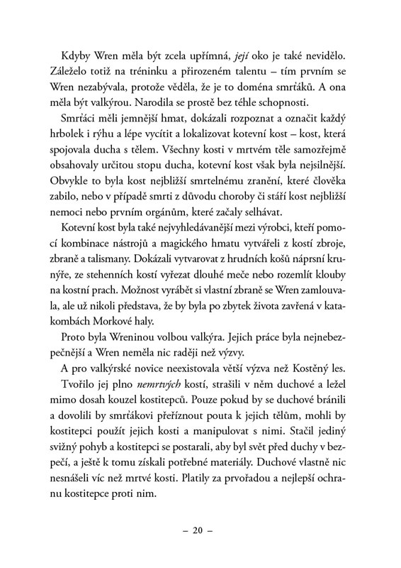 Stát se valkýrou – bojovnicí proti duchům – je pro kostitepkyni Wren šancí, jak upevnit své místo ve vznešeném Kostěném rodu. Když se ale stane obětí zákeřné léčky, vykáže ji společenství do pustiny za hraniční zdí, kde se to hemží nemrtvými. Jediný způsob, jak se dostat zpět, je spojenectví s Julianem z nepřátelského Železného rodu. Wren s ním zprvu neustále bojuje, ale ukáže se, že jeden druhého zoufale potřebují. Jen spolu mohou zabránit děsivému spojenectví, které vzniká mezi živými a nemrtvými…
