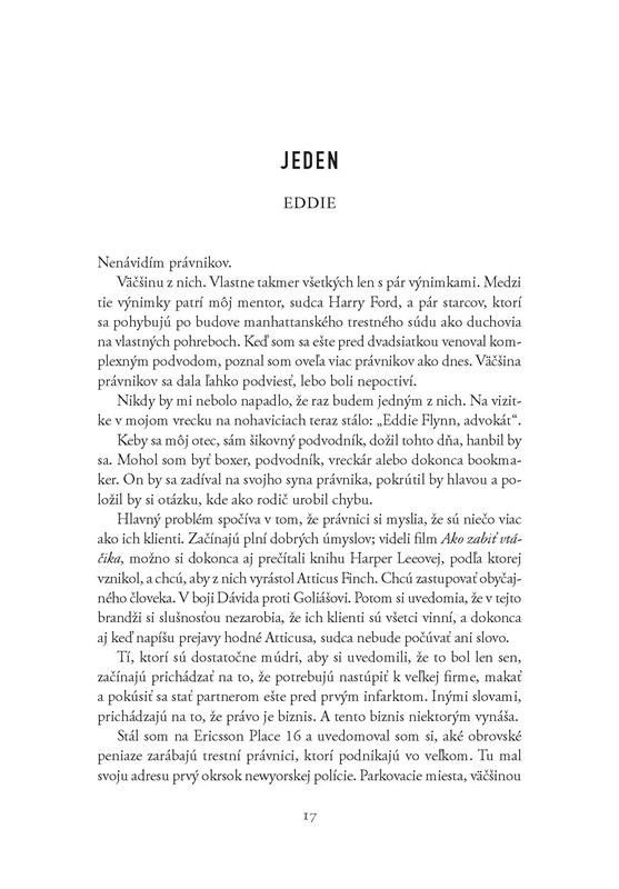 Jedna zo sestier zavolala na tiesňovú linku schovaná v kúpeľni, druhá urobila to isté pozerajúc sa na beštiálne zohavenú mŕtvolu ich otca. Obe teraz čaká súd za rovnaký zločin, ale každá tvrdí, že je nevinná. Klame Alexandra alebo Sofia? Nevie to ani Eddie Flynn, ostrieľaný právnik, ktorý kedysi sám porušoval zákon a jednu z nich teraz obhajuje. Keď začnú pribúdať mŕtvoly, uvedomí si, že vražda bohatého bývalého starostu New Yorku nebola ojedinelým incidentom. Pravda je oveľa zamotanejšia, než sa na začiatku zdalo.