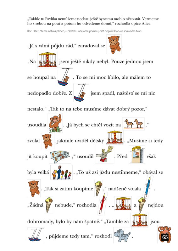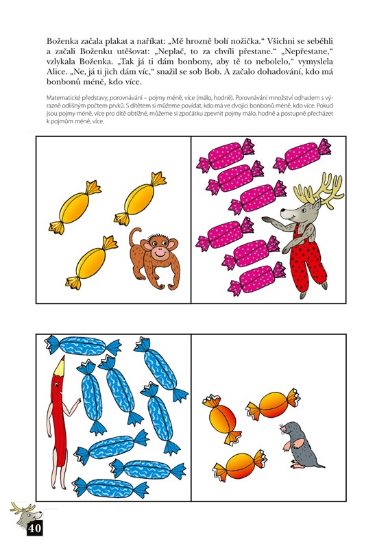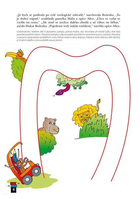 Zmiňuji-li předcházející publikace uvedené autorky, jsou jimi soubory pro rozvoj zrakového vnímání dětí, grafomotoriky, matematických představ, vždy také bylo pamatováno na rozvoj řeči, myšlení. Tato kniha, která vás zaujala, obsahuje výběr úkolů vhodných pro nejmladší předškoláky. Najdete v ní všechna uvedená cvičení označená piktogramy, jejichž význam objevíte na straně 71 v autorčině informaci pro vás, dospělé. Tak můžete sledovat, jak se dítě postupně zdokonaluje v jednotlivých dovednostech důležitých pro budoucí čtení, psaní, počítání, jak se rozvíjí jeho slovní zásoba, schopnost komunikovat. Uvidíte, jak se vám společně s dítětem bude dobře a s chutí pracovat, protože vás povede příběh plný zajímavých postaviček. Udivilo vás, jak se v Zoo ocitly mluvící pastelky Boženka a Máňa? To právě ony provázely děti v knihách pro rozvoj grafomotoriky. Konečně i další postavičky najdete ve dříve vydaných knihách. Jak vidíte, autorka, významná speciální pedagožka, připravila zajímavý, promyšlený soubor přispívající k úspěšnosti budoucích školáků.