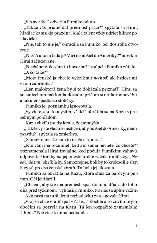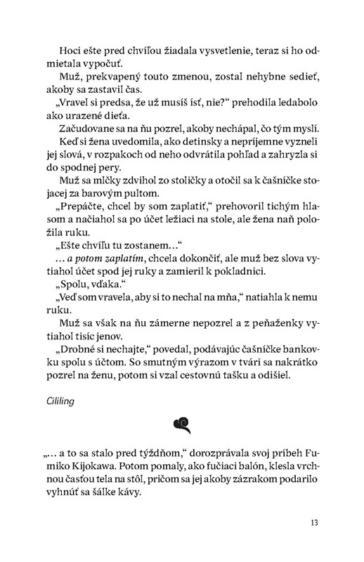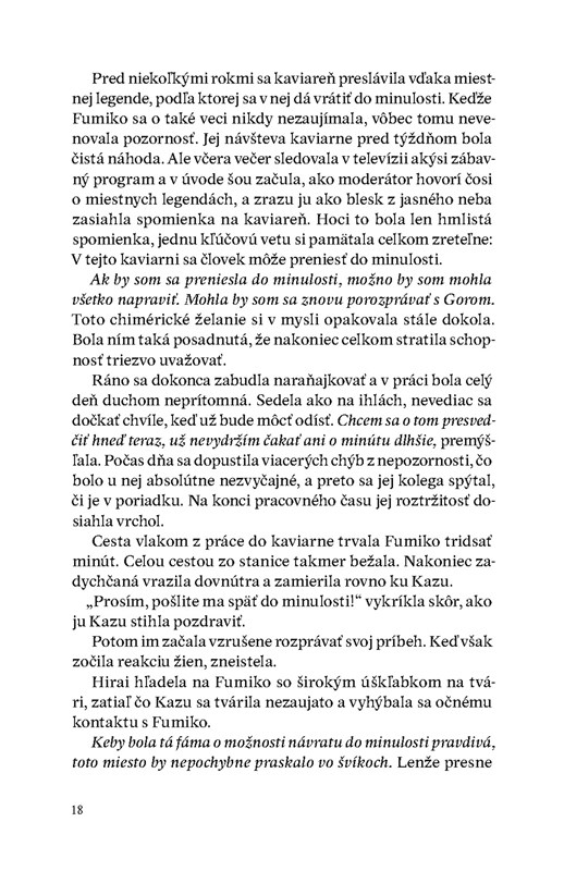 Má to však háčik. Môžete sa stretnúť len s ľuďmi, ktorí kaviareň už niekedy navštívili. Nech urobíte čokoľvek, prítomnosť tým nezmeníte. Pri pobyte v minulosti sa nesmiete pohnúť z presne určeného miesta. Váš čas v minulosti sa začína zaliatím kávy a končí sa v okamihu, keď káva vychladne. A to sme zďaleka nevymenovali všetky zo zoznamu čudesných pravidiel...